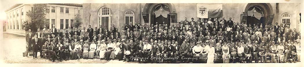 Panoramic photograph of the Praetorian State Senate at Corsicana, Texas, April 299-30, 1915 (caption in white across lower center). Photo was made by Montgomery Cralley (name in white at loser right corner).