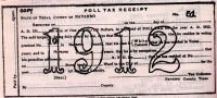 | CERTIFICATE OF EXEMPTION #1; Name: W. O. Allmon; Date: 3 December 1912; Age 21; White; Occupation: Farmer; Lived 14 years in Texas; 14 years in Navarro County; Resides: Birdston for 14 years. Exempt from payment of poll tax by reason of not being 21 by 1 February 1912. |