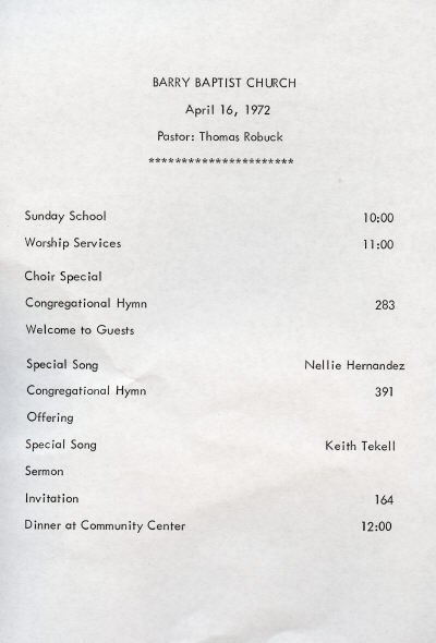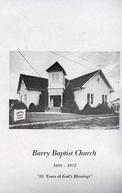 The following history was taken from the Barry Baptist Church program for April 16, 1972 in celebration of their 81st year. It was submitted by