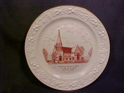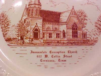 Corsicana Texas Church Scene Plate Laughlin China. Circa 1950's, this plate was made by the Homer Laughlin China Company. The plate has a view of the Immaculate Conception Church in the center, this was in Corsicana, Texas. This building was torn down to make a parking lot. |