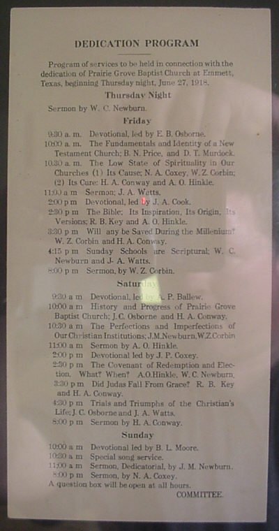 Prairie Grove Baptist Church1918 Dedication ProgramEmmett, Navarro County Texas