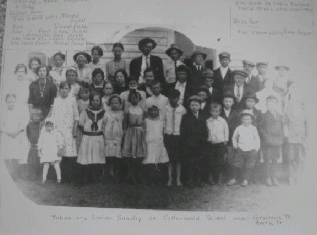 second from right Carl's sister, fourth from right Robert Owen, fifth from right Carl's brother (their father was Hood Owens). Back Row: fourth from left, Ruby Owen. Picture was taken "Easter Sunday at Cottonwood School, Barry, Texas" about 1914.