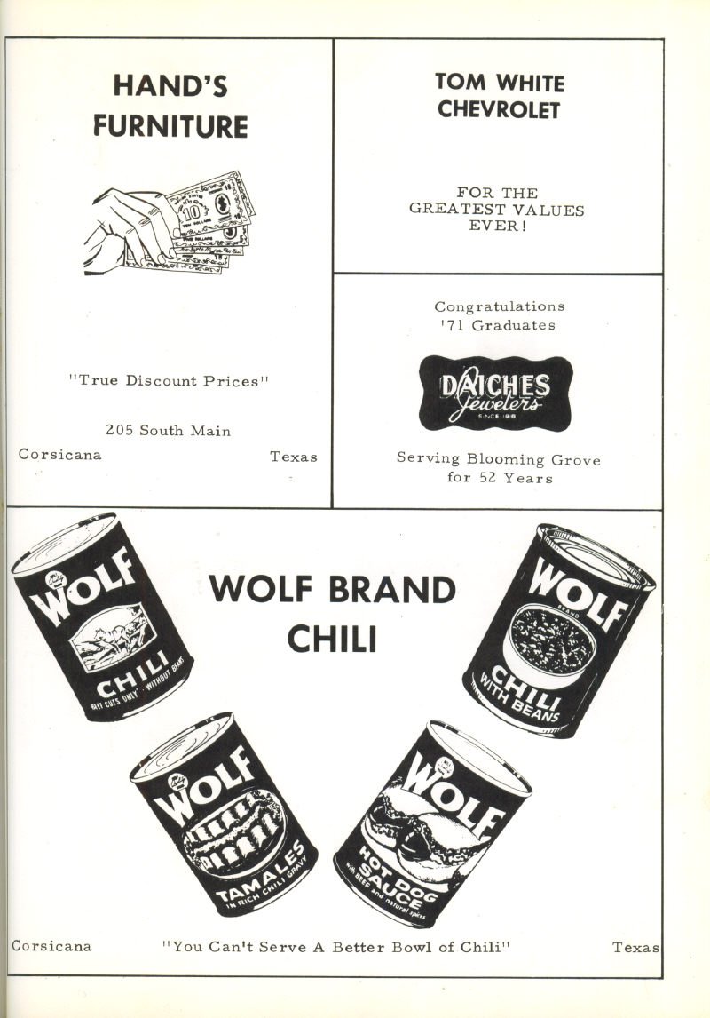 Ads Hands Furniture; Tom White Chevrolet; Daiches Jewelers; Wolf Brand Chili