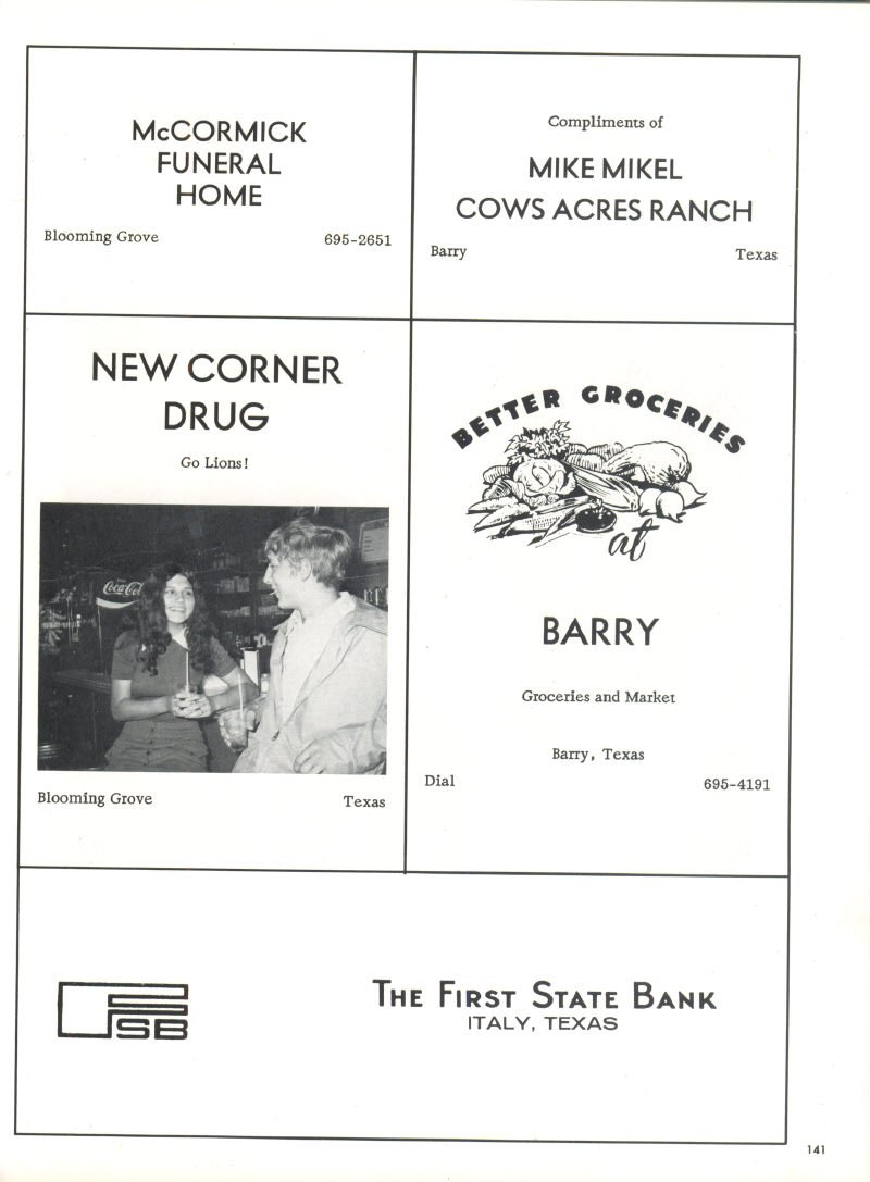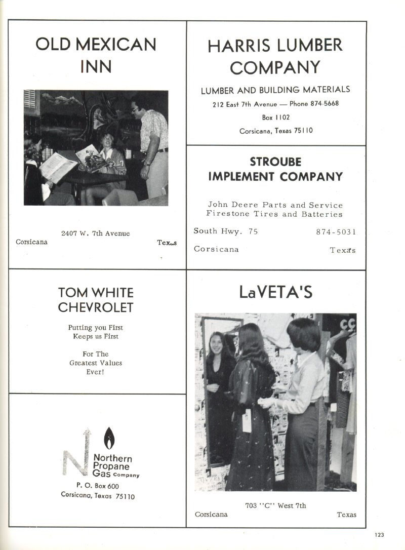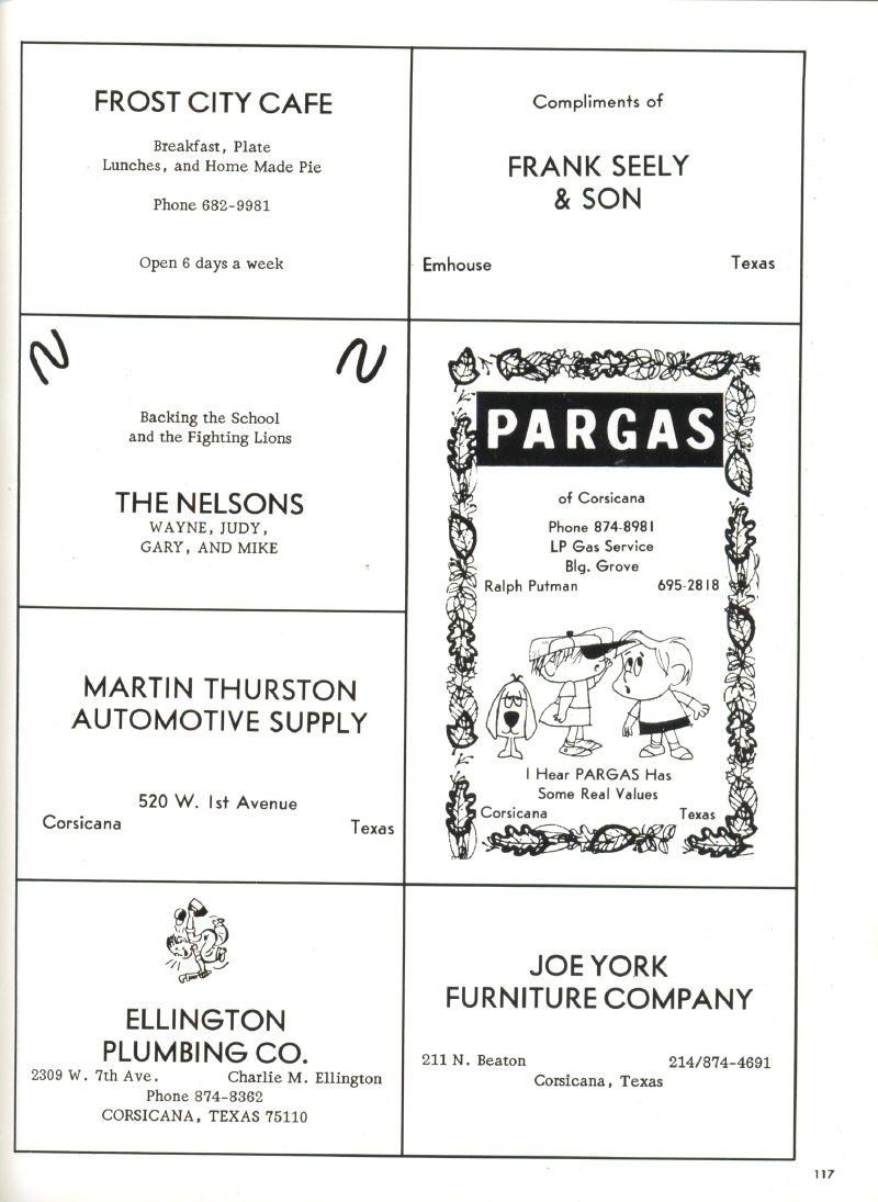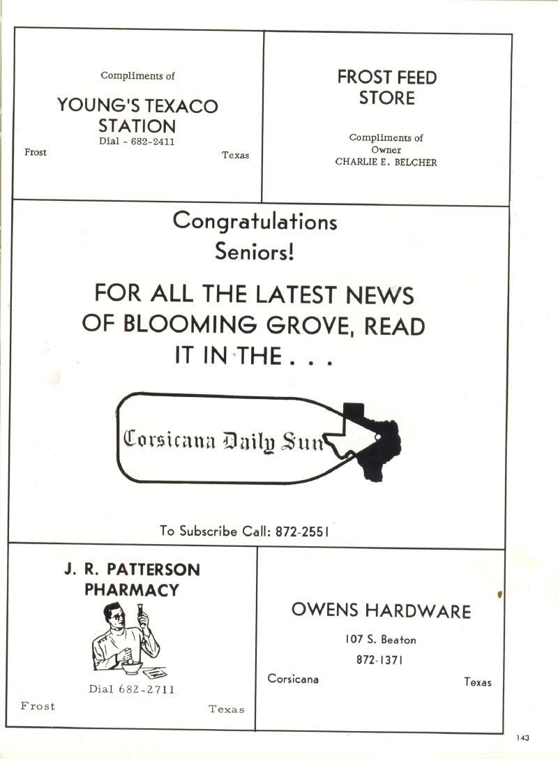 Frost Feed Store; Corsicana Daily Sun; J. R. Patterson Pharmacy; Owens Hardware