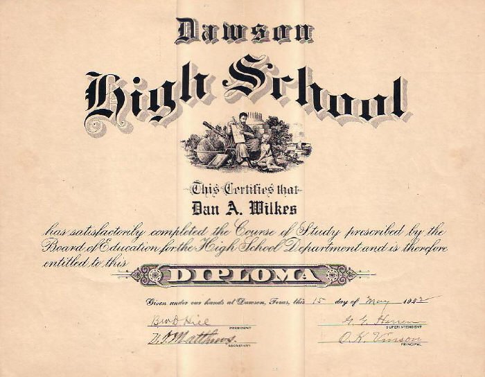 Dan Allan Wilkes 1922 Dawson High School Diploma Dawson, Navarro County, Texas