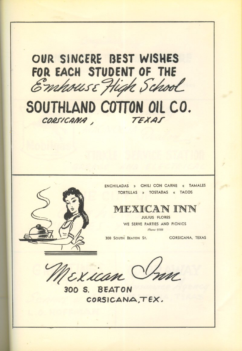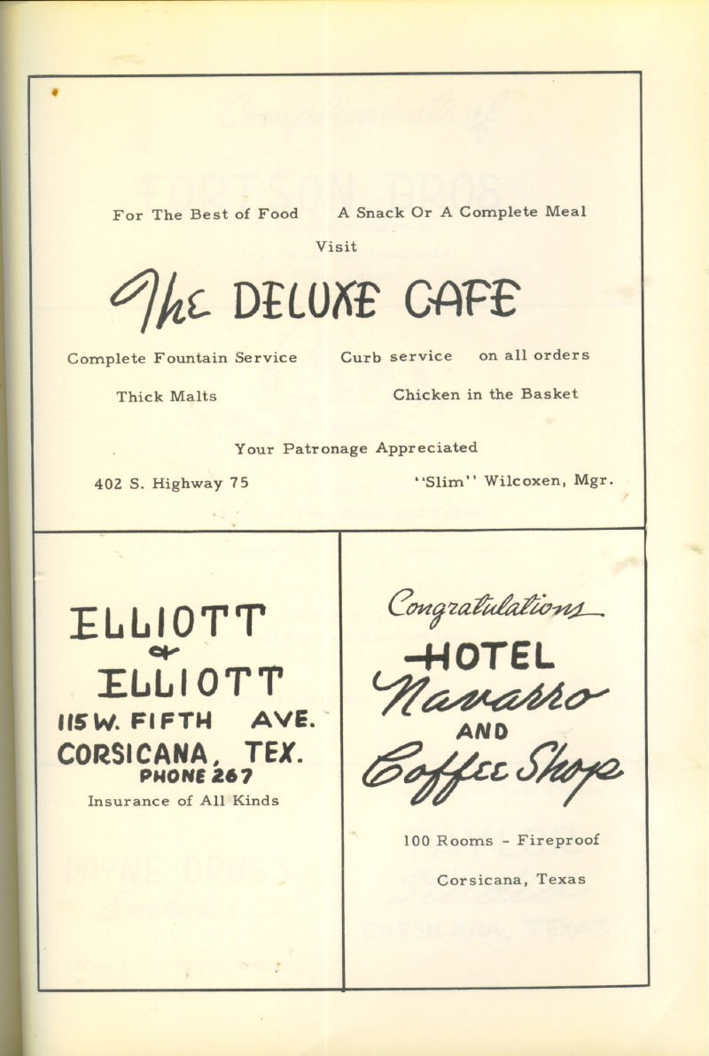 Advertising – Slim Wilcoxen’s The Deluxe Café, Elliott & Elliott Insurance, Hotel Navarro and