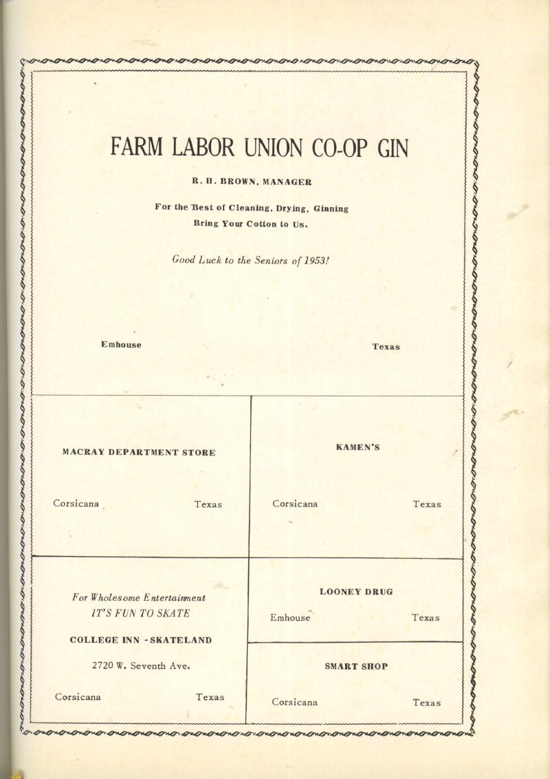 ADVERTISING – R. B. Brown Mgr. Farm Labor Union Co-op Gin, Macray