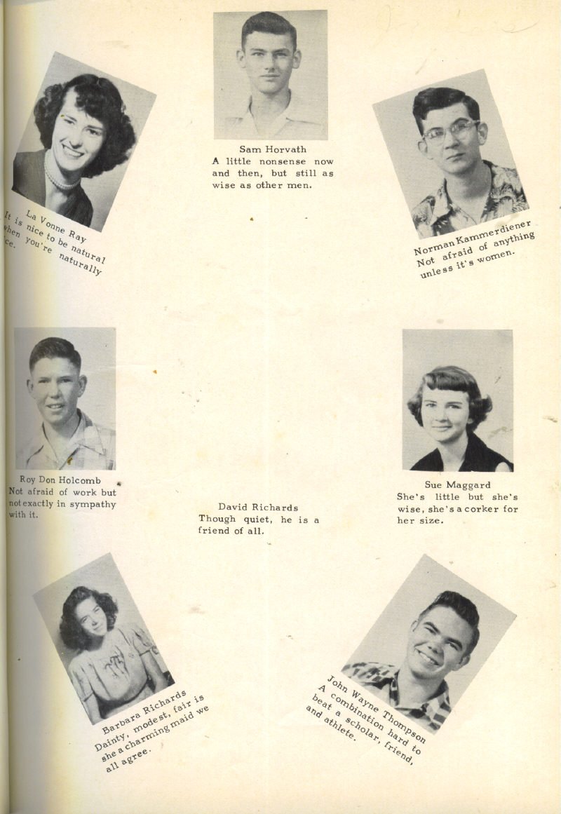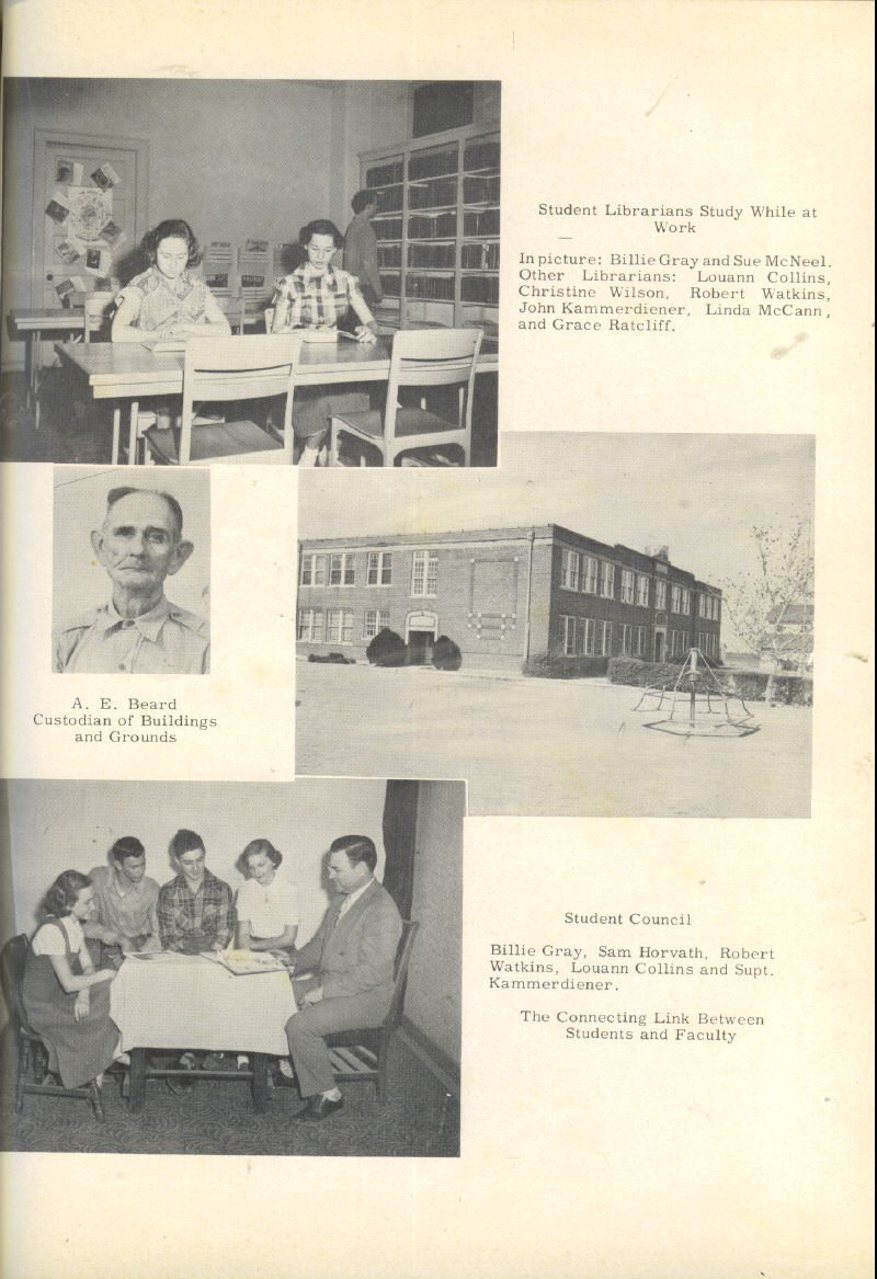 Linda McCann, Grace Ratcliff; GOOD PICTURE OF SCHOOL; CUSTODIAN – A. E. Beard; STUDENT COUNCIL –Billie Gray, Sam Horvath,