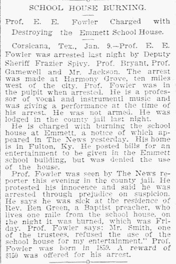 Corsicana, Tex., Jan. 9. Prof. E. E. Fowler was arrested last night