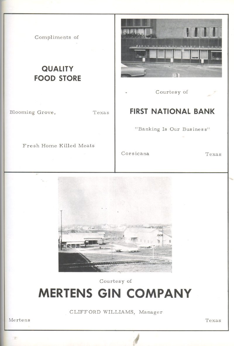 Ads - Quality Food Store - First National Bank - Mertens Gin