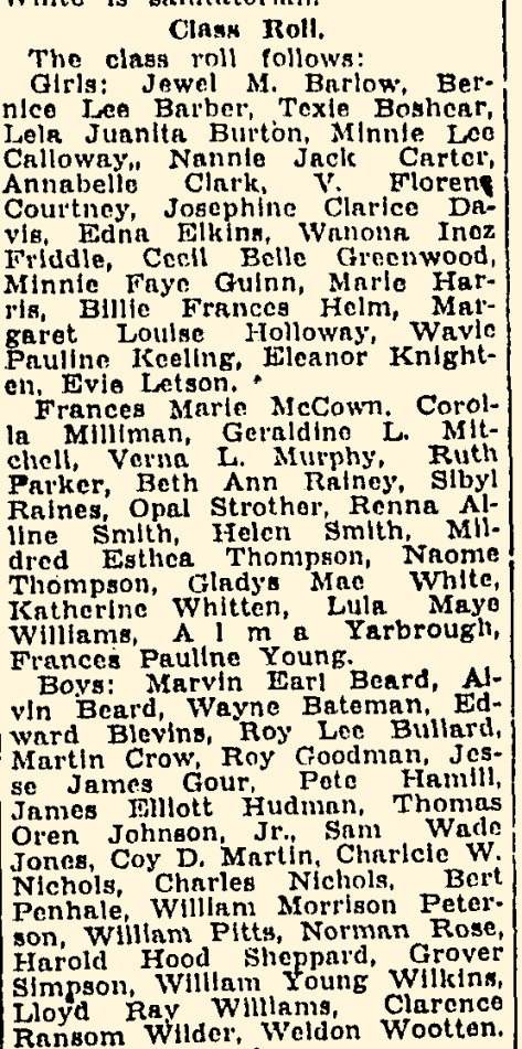 Girls: Jewel M. Barlow, Bernice Lee Barber, Texia Boshcar, Lela