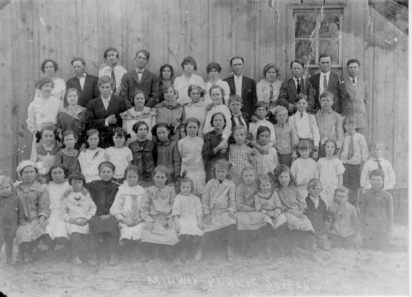 Photo of the School at Midway, Navarro County, Texas in 1914 Top Row (Left to Right) Gladys DuBose, William L. Beauchamp, Mamie Sanders, Carson Fitch, William "Bill" Steele, Gayna Knowles, Laura Knowles, James Haywood, Ruth Fitch, Henry Dexter Beauchamp, Mr. Justice (Teacher), and Garner Steele.