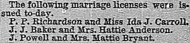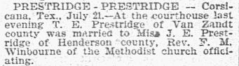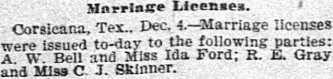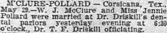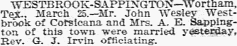 March 25. - Mr. John Wesley Westbrook of Corsicana and Mrs. A. E. Sappington of