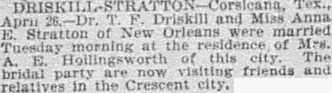 April 26. - Dr. T. F. Driskill and Miss Anna E. Stratton of New Orleans were