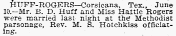 Tex., June 10. - Mr. B. D. Huff and Miss Hattie Rogers were