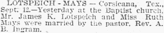Mr. James K. Lotspeich and Miss Ruth Mays were married by the