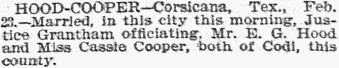 Tex., Feb. 23. - Married, in this city this morning, Justice