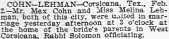 Tex., Feb. 2. - Mr. Max Cohn and Miss Melina Lehman, both of