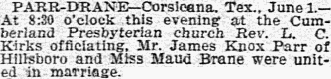 PARR-DRANE - Corsicana. Tex, June 1. - At 8:30 o'clock this evening at the