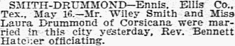 Tex., May 16. - Mr. Wiley Smith and Miss Laura Drummond