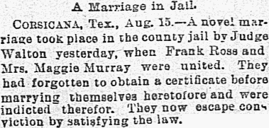 Corsicana, Tex., Aug. 15 - A novel marriage took place in the county jail by