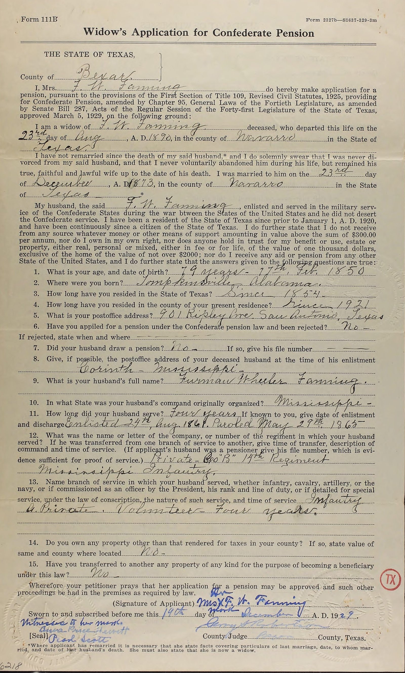 3rd Sgt. under Capt. Samuel Wright's 19th Regiment Texas Troops. Col. N. M.