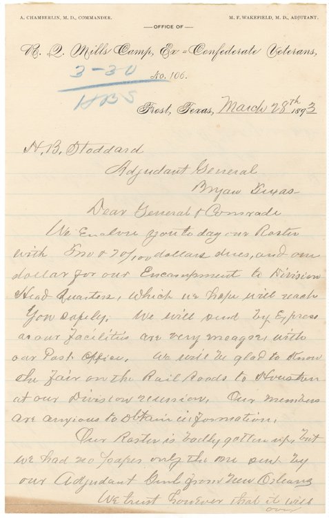 Roger Q Mills Camp Letter Mar 28, 1893 Navarro County, Texas